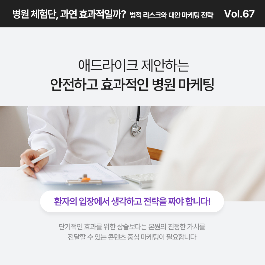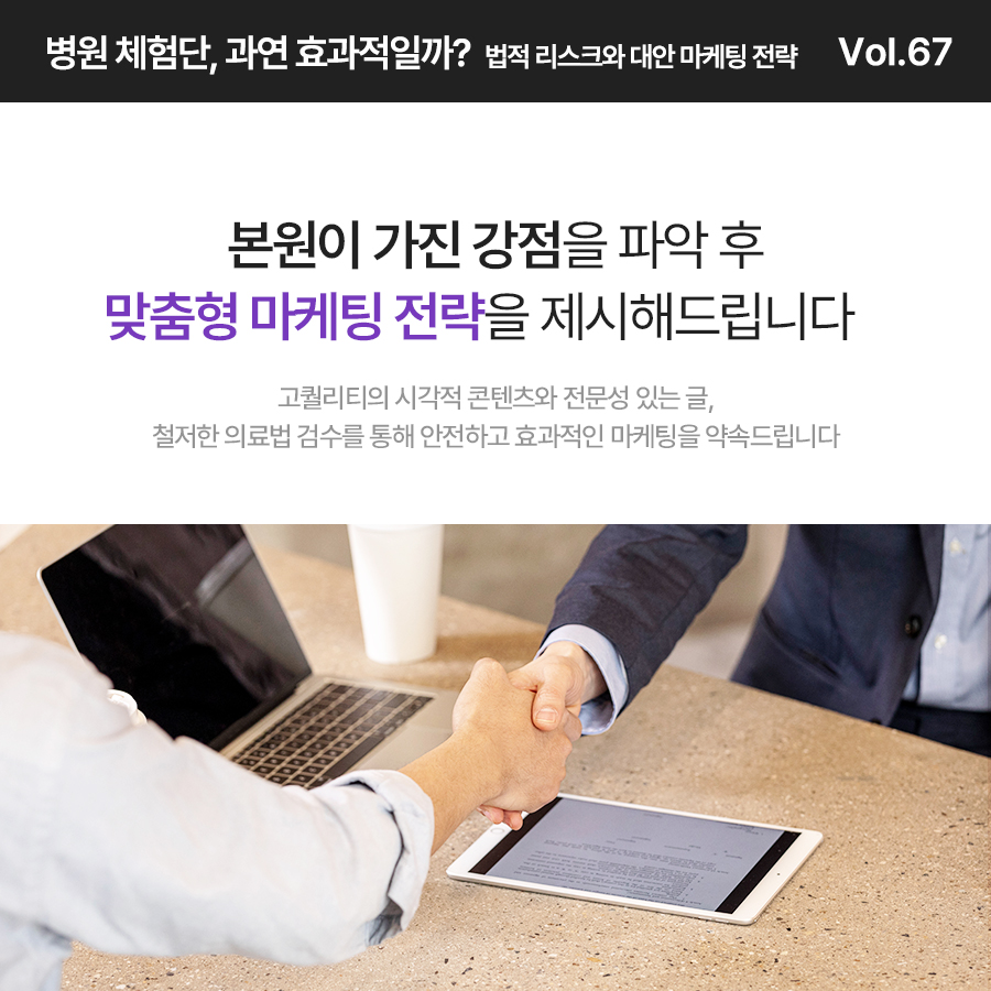 이러한 전문성을 바탕으로 의료법에 저촉되지 않으면서도 효과적인 맞춤형 전략을 제시해 드립니다.