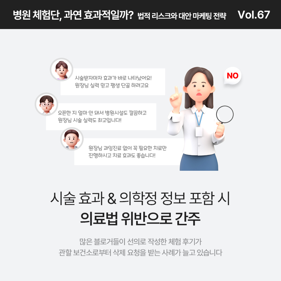 체험단의 후기가 시술 효과나 의학적 정보를 포함할 경우, 이는 명백한 의료법 위반으로 간주될 수 있습니다.