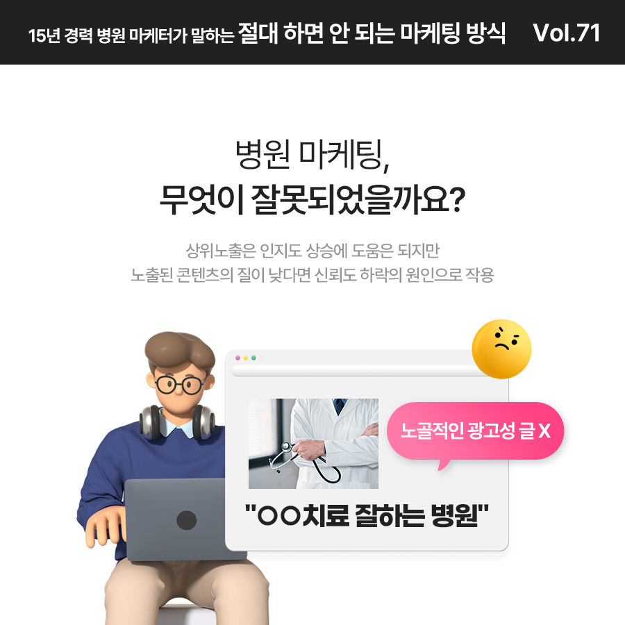 상위노출 된 콘텐츠의 질이 낮다면 오히려 병원 신뢰도 하락의 원인이 됩니다.
