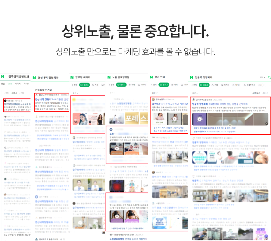 그러나 냉정히 말씀드리자면 상위노출 자체는 병원마케팅의 일부일 뿐, 궁극적인 목표가 될 수 없습니다.