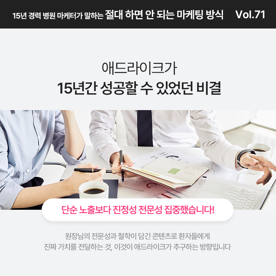 병원의 진짜 가치를 알리고 지속 가능한 성장을 원하신다면 언제든 애드라이크의 문을 두드려주세요.
